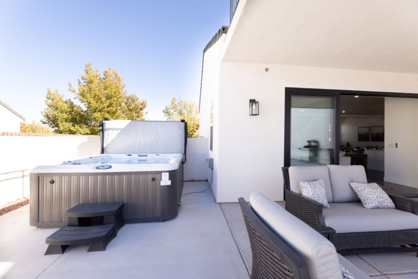 The home is packed with features that elevate your stay—from a private pool to smart TVs throughout, a gaming console, and an inviting outdoor fireplace perfect for evenings under the desert sky.